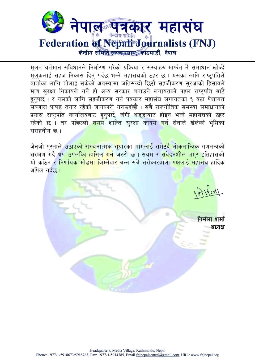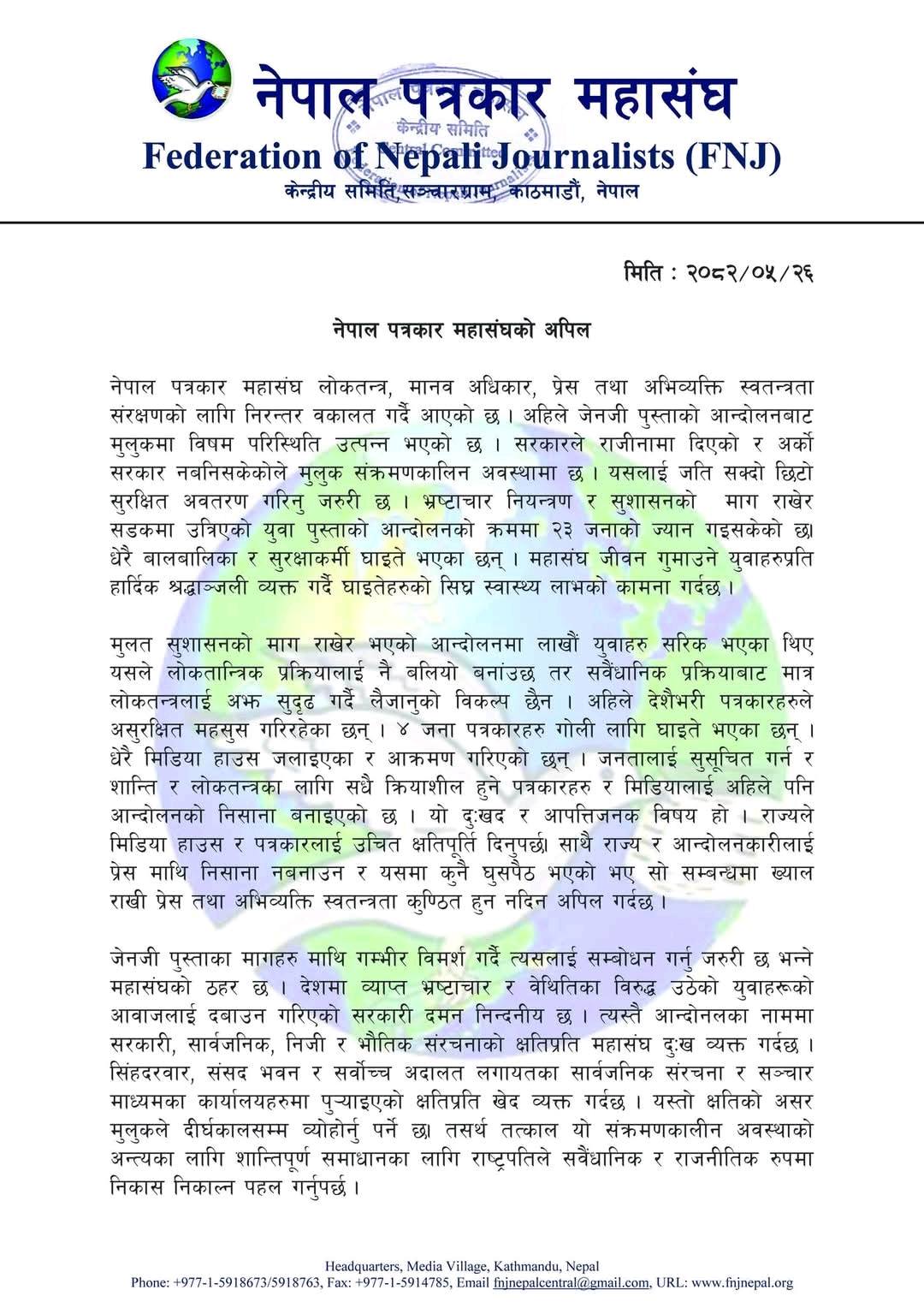 ‘अहिले देशैभरि पत्रकारहरूले असुर क्षित महसुस गरिरहेका छन्। ४ जना पत्रकारहरू गोली लागि घाइते भएका छन्। धेरै मिडिया हाउस जलाइएका र आक्रमण गरिएका छन् । जनतालाई सुसूचित गर्न र शान्ति र लोकतन्त्रका लागि सधैँ क्रियाशील हुने पत्रकारहरू र मिडियालाई अहिले पनि आन्दोलनको निसाना बनाइएको छ,’ महासंघ अध्यक्ष निर्मला शर्माले बिहीबार निकालिएको विज्ञप्तिमा भनिएको छ ।