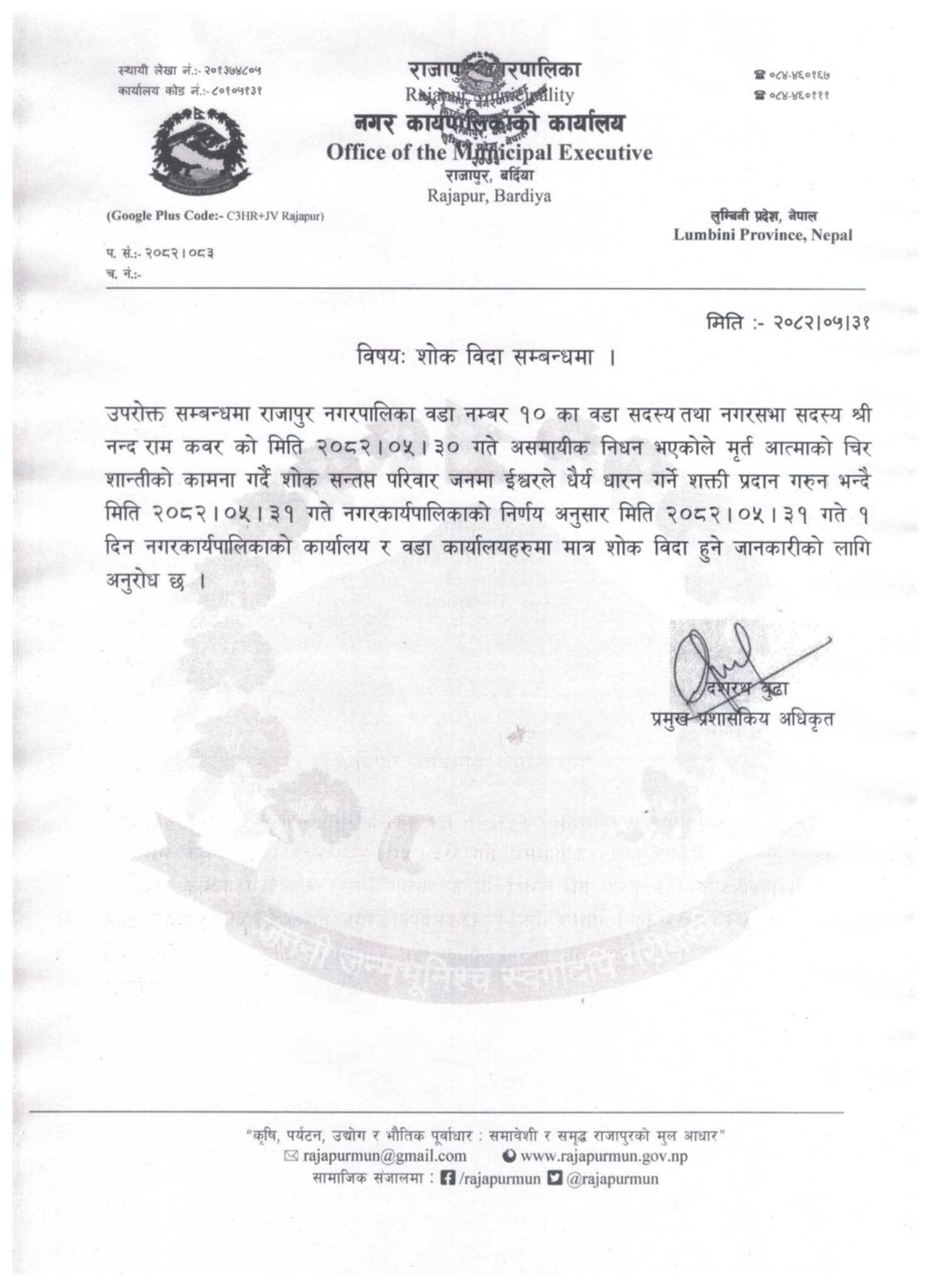 केशव कोइराला, राजापुर । बर्दियाको राजापुर नगरपालिकाले आज शोक विदा दिएको छ । लामो समय देखि स्वास्थ्यमा समस्या देखिएका राजापुर नगरपालिका वडा नं १० का वडा सदस्य एवं नरसभा सदस्य ६७ बर्षिय नन्दराम कवरको असमायीक निधन भएकोले नगरपालिकाले शोक विदा दिएको हो ।